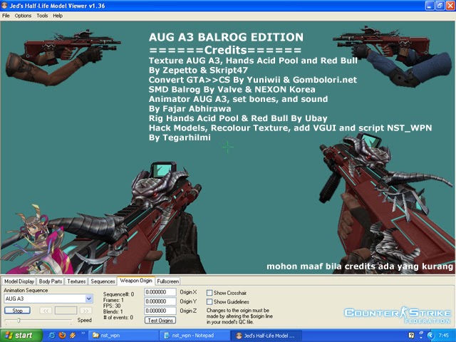 | Screenshot : In Jed's Half Life Models Viewer V1.36 SS 2 In Game Maps as_crazytank2 Credits : Zepetto - Texture AUG A3, Hands Acid Pool and Red Bull Skript47&Korle - Convert PB>>GTA Yuniwii & Gombolori.net - Convert GTA>>CS Valve & NEXON Korea - SMD Balrog Fajar Abhirawa - Animator, set bones, and sound AUG A3 FEAR - Sight Laser PB Ubay - Rig Hands Acid Pool & Red Bull MS3D - Tools Tegarhilmi - Hack Models, Recolour Texture, add VGUI & script nst_wpn *Mohon maaf bila credits ada yang kurang Link Download : Download Click Script nst_wpn and Password in RAR