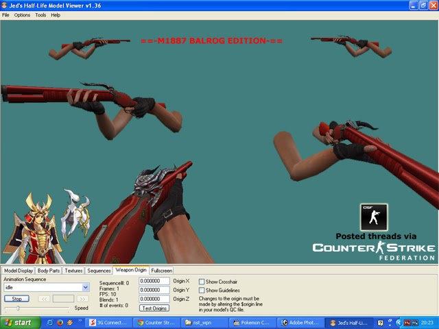 | M1887 Balrog Edition Screenshot : In Jed's Half Life Models Viewer V1.36 In Game Credits : Zepetto - Texture M1887 Valve & NEXON Korea - Hands CSO and SMD Balrog Balistic - Animator of M1887, set bone, and sound Hessho - hit box w models Tegarhilmi - HM, Recolour Texture, make VGUI, make W models, Add Script NST_WPN Dan lain-lainnya : Skript47&Korle *NB : Jika credits ada yang kurang, PM saya Script NST_WPN : Code [type]3[name]M1887 Balrog Edition[model]m1887_balrog_pb[wchange]21[damage]5[speed]1[zoom]0[clip]10[ammo]64[recoil]1.1[gravity]250[knockback]0.6[reload]0[deploy]0[fastrun]0[sight_time]0[sight_model][cost]800[sound]1[team]0[buy]1[k_time]0.57[k_radius]75[k_damage]4[k_deploy]0.5[k_knockback]3.1